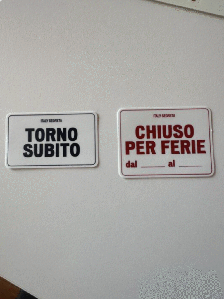 1/6 Torno in Ferie Sticker Pack €5,00 In stock Quantity Torno in Ferie Sticker Pack quantity Add to cart View cart Description Slap these stickers onto phones, computers, notebooks, and more to kindly let everyone know you’re OOO. Made from thick, durable vinyl that can weather scratches, rain, and sun (absolutely essential during an Italian summer!). Details Includes one “Chiuso per Ferie” individual sticker and one “Torno Subito” individual sticker. Size Chiuso per Ferie: 7 cm x 5.2 cm Torno Subito: 7 cm x 4.2 cm Shipping & Returns